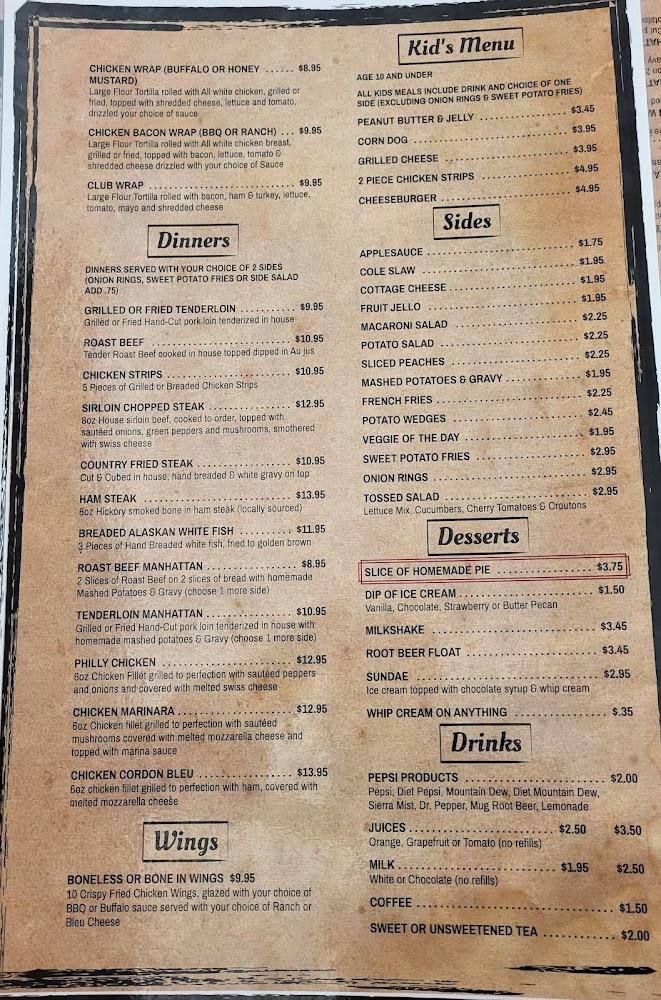 Diners can expect generous portions across the board. From salads to childhood favorites like chicken strips, the menu caters to various tastes. Don't forget to save room for dessert; their pies are known to be exceptional and often run out!