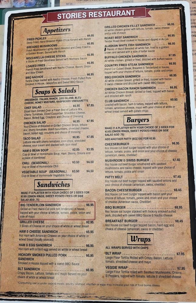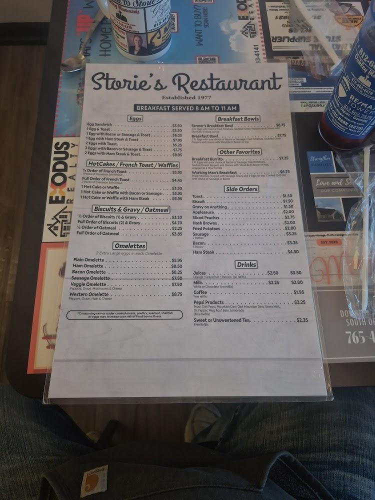 Storie's offers a diverse menu that emphasizes traditional American comfort food. Breakfast shines with options like pancakes, omelets, and breakfast sandwiches. Lunch and dinner menus feature favorites ranging from tenderloin to grilled cheese sandwiches.